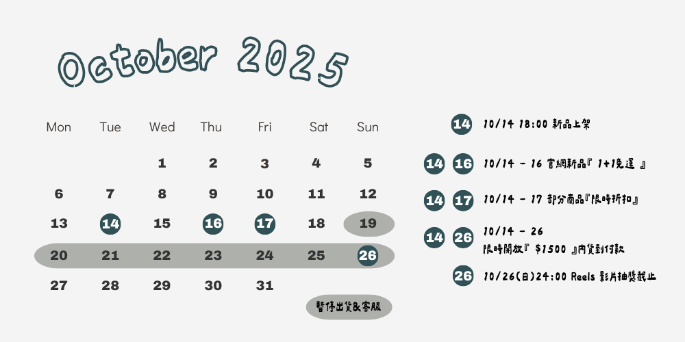 |新品優惠活動|◍ 10/14(二)18:00官網新品上架◍ 10/14(二)- 10/16(四)官網新品『 1+1免運 』◍ 10/14(二)- 10/17(五)部分商品『限時折扣』◍ 10/17(五)- 10/26(日)限時開放『 $1500 』內貨到付款◍ 10/26(日)24:00 Reels 影片抽獎截止. Reels影片一週內抽出得獎者,若有下單可直接退費🔺Summer Sale 10/31 24:00截止🔺🔺 10/19 (日) - 10/26(日)暫停出貨