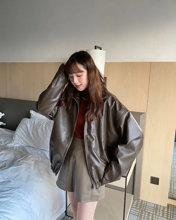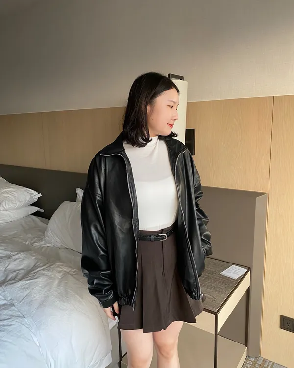 OverSize寬鬆翻領下縮口皮外套