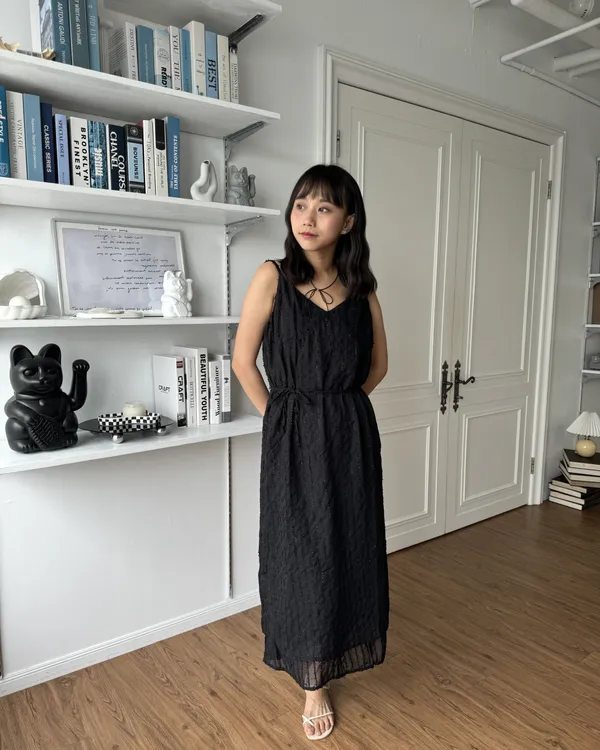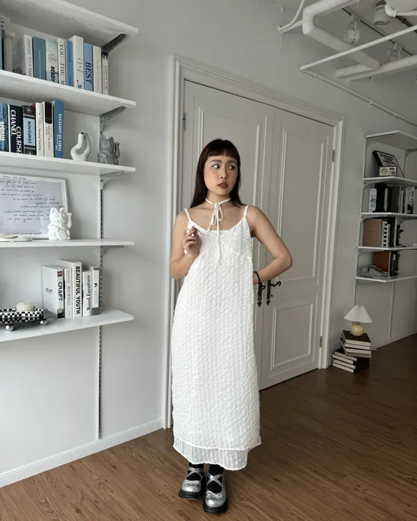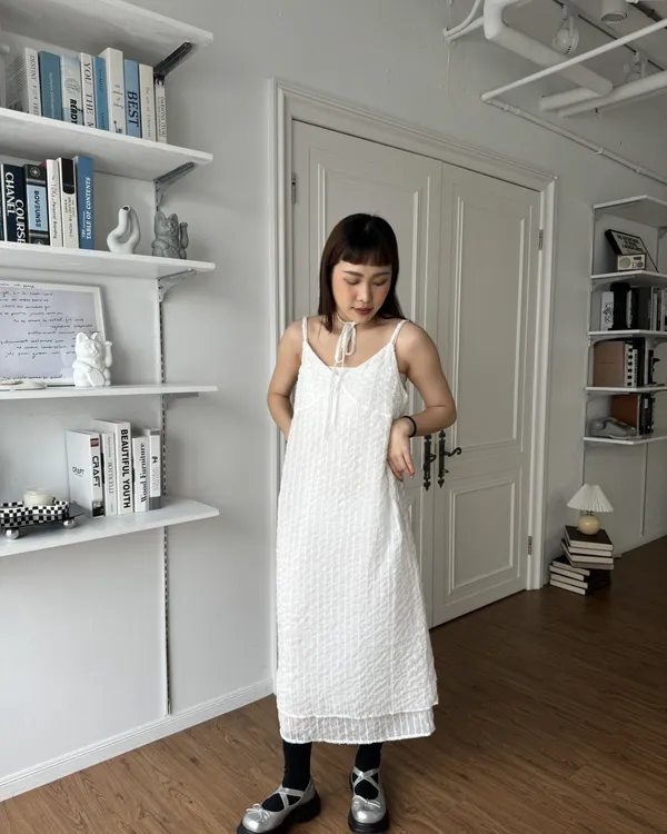 法式假兩件立體織紋細肩長洋裝 (附綁帶)3colors