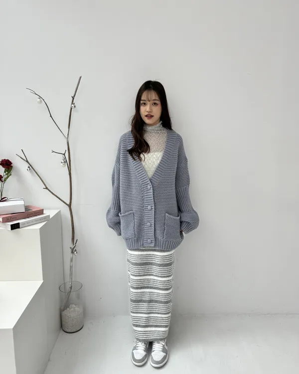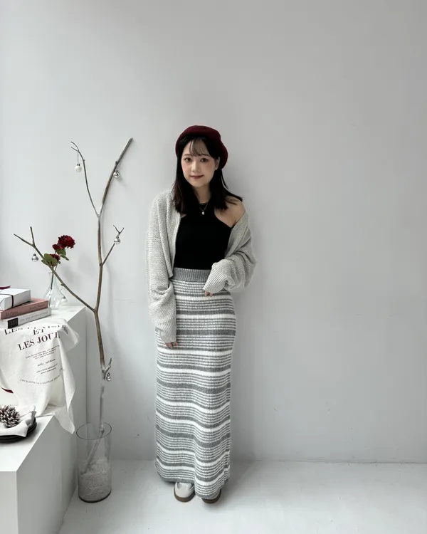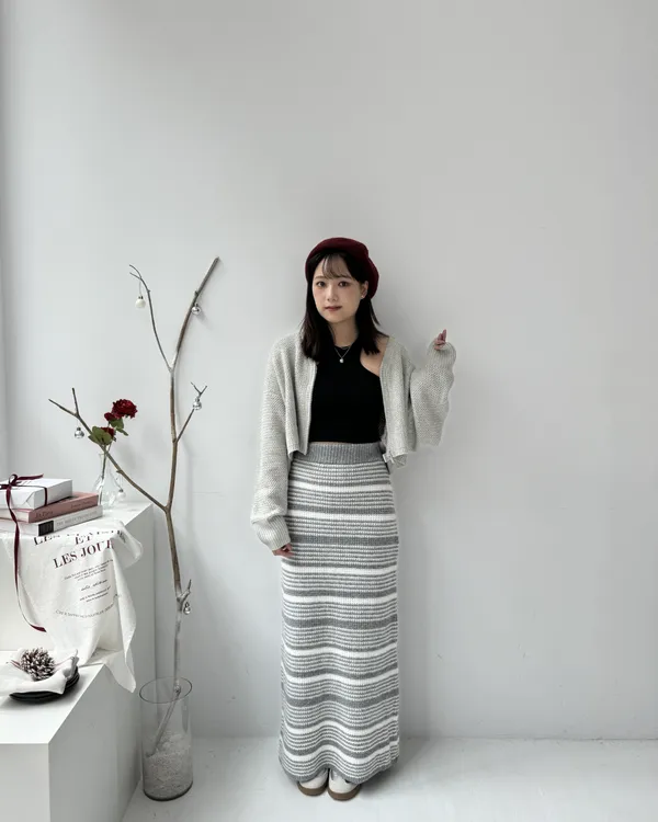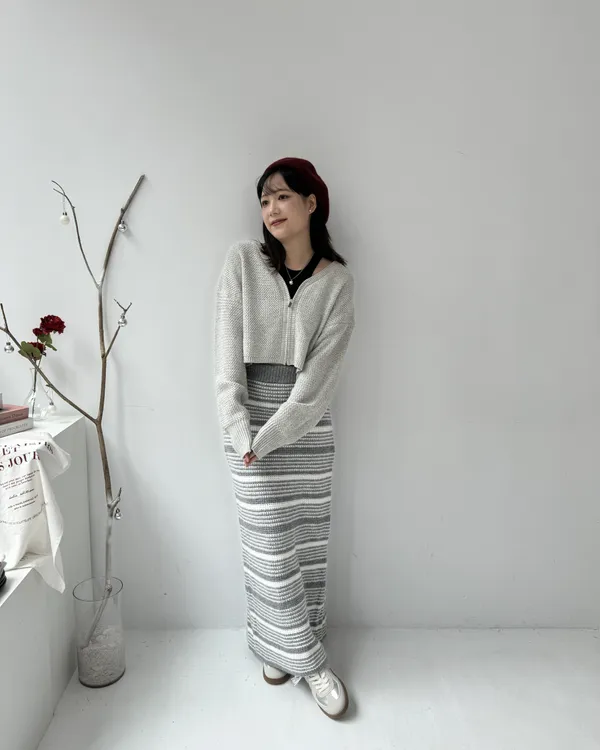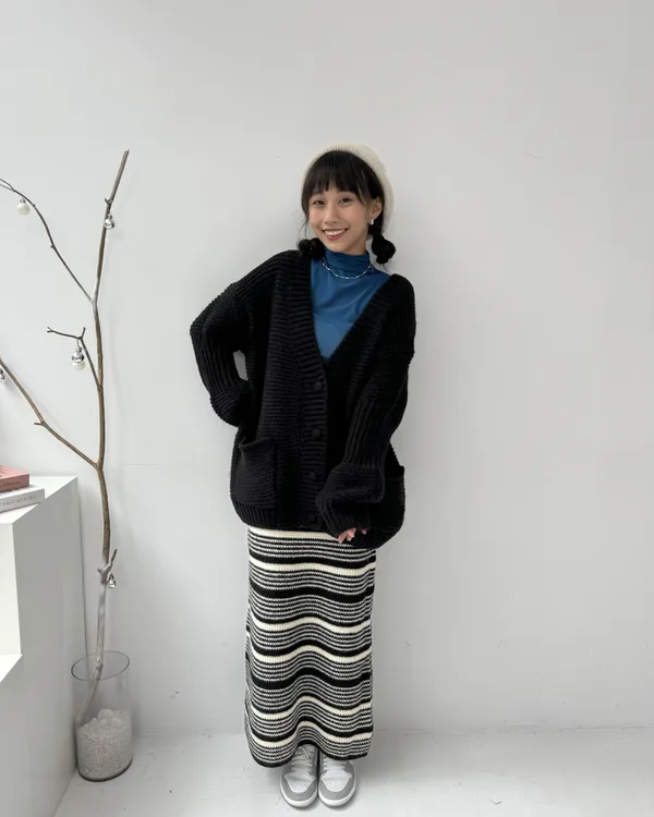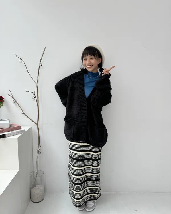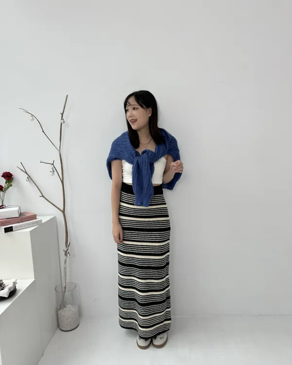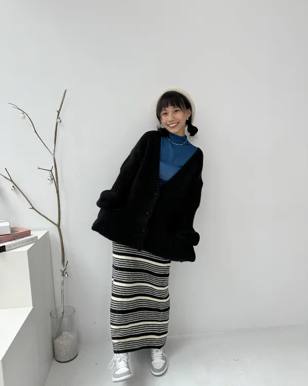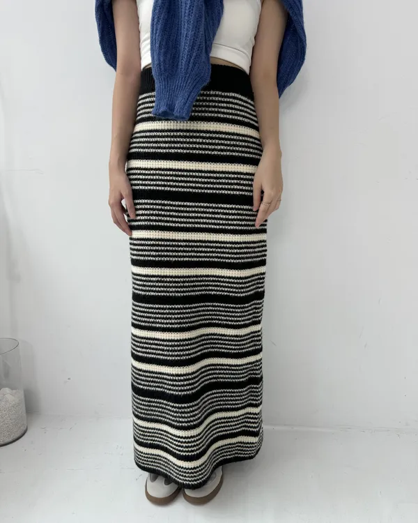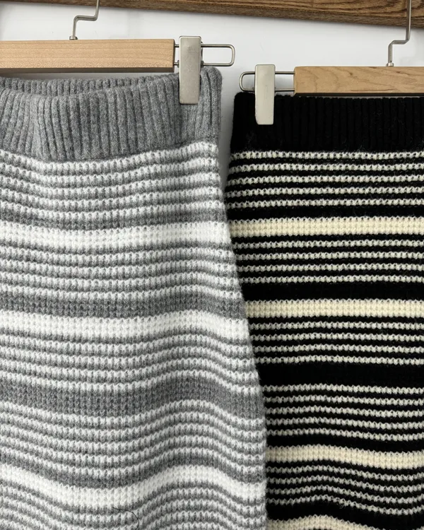 厚磅條紋後開衩針織長裙 2colors