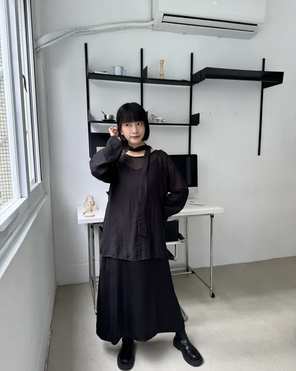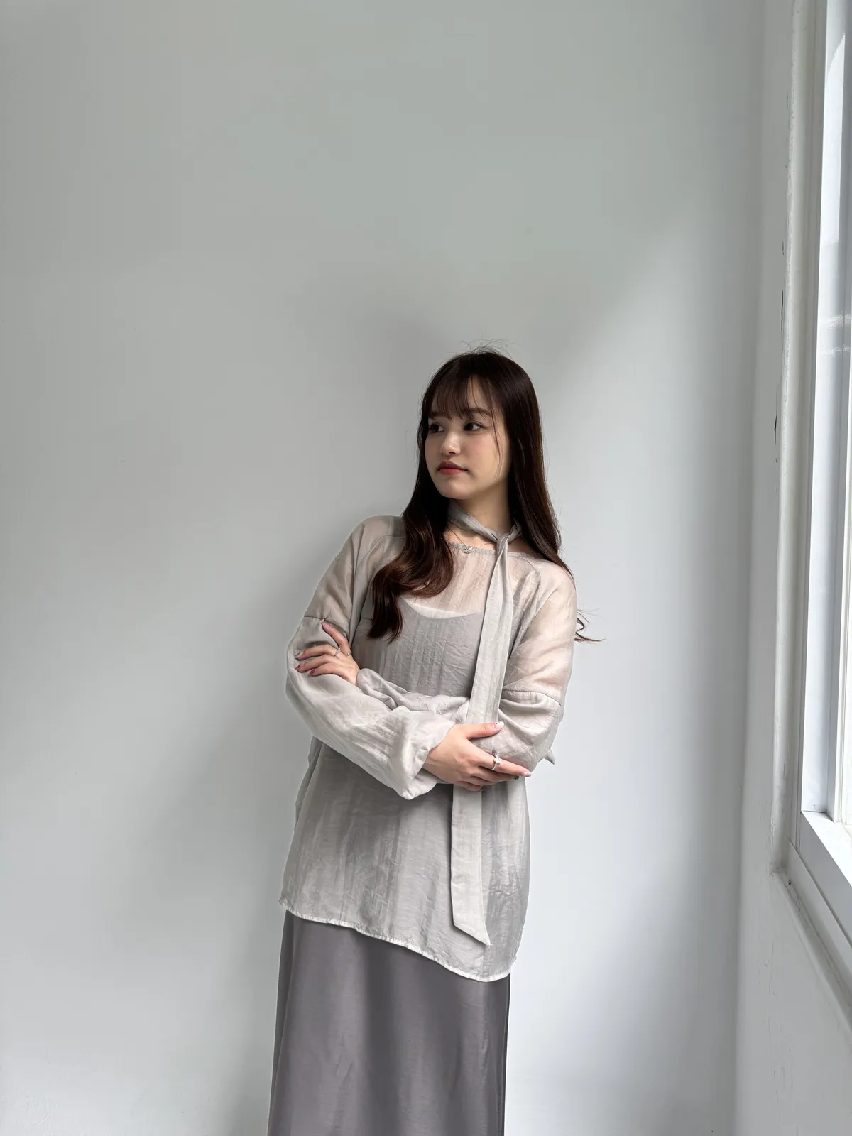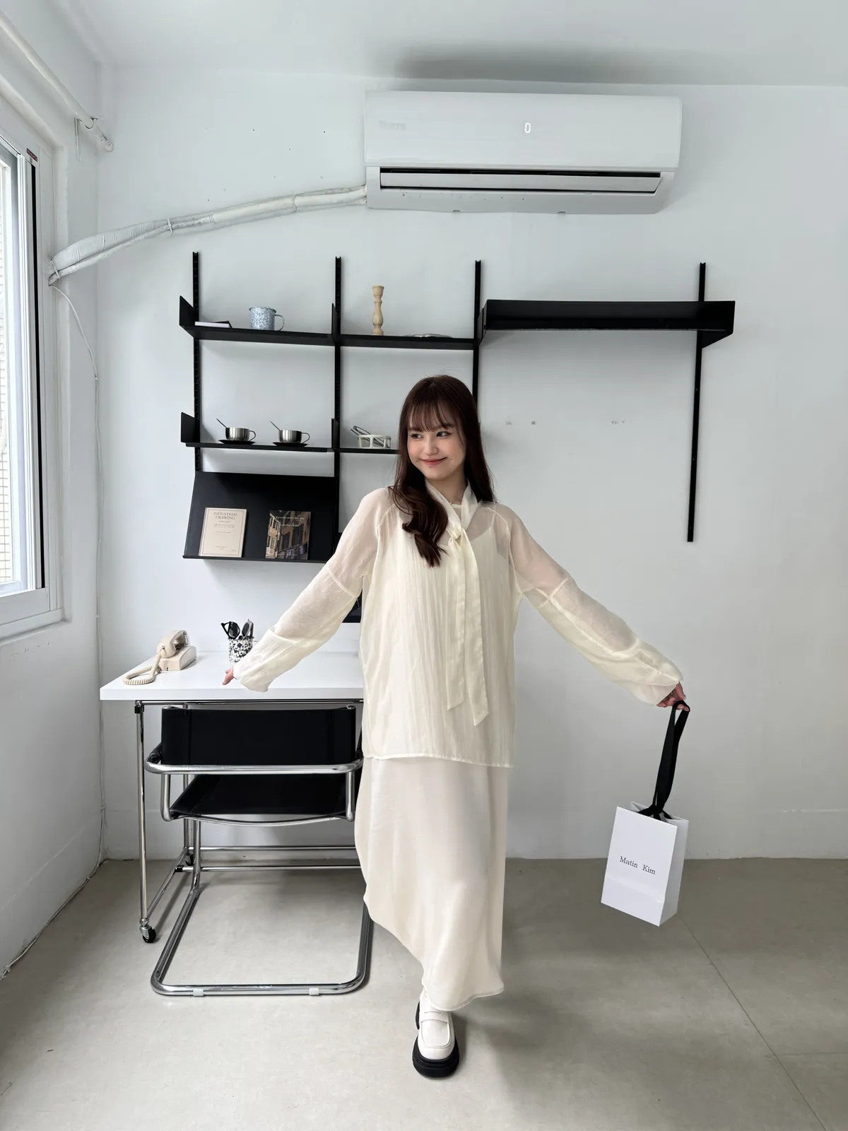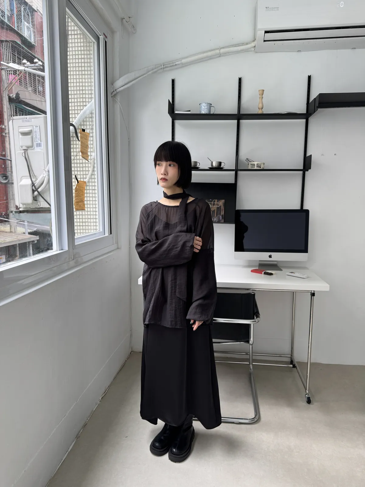 仙女系緞面洋裝+澎袖透膚上衣Set組(附綁帶) 4colors
