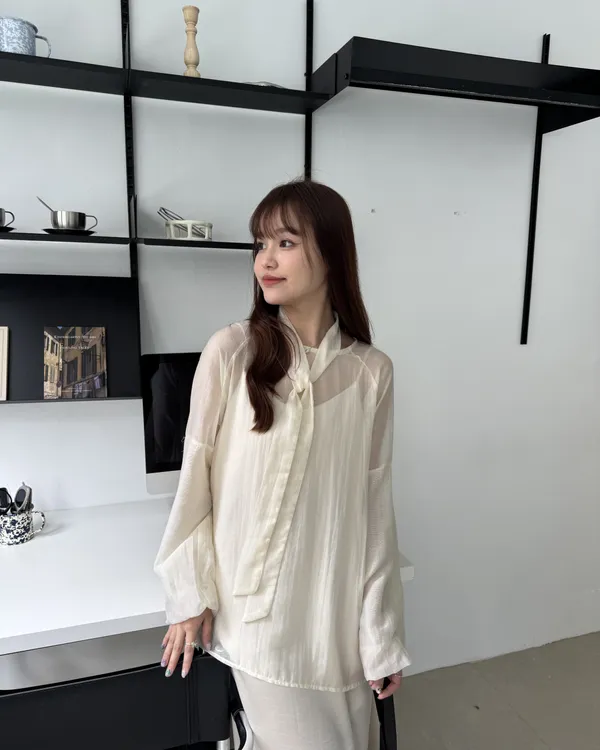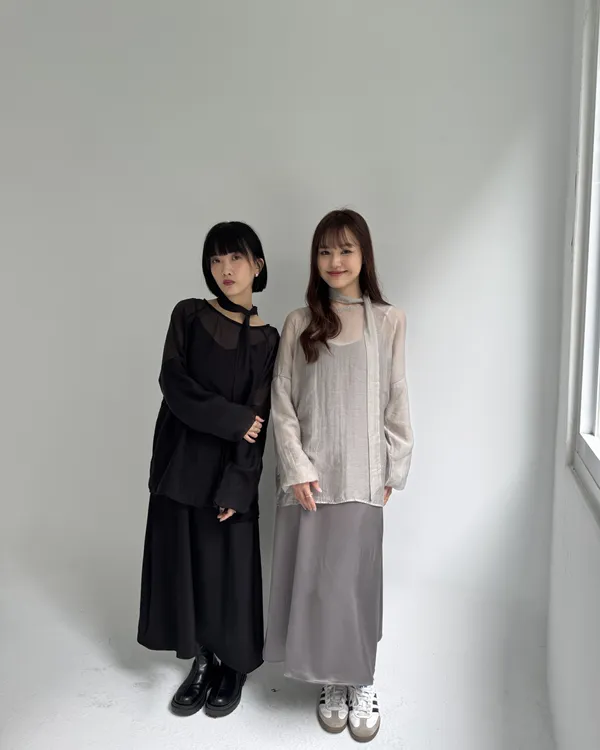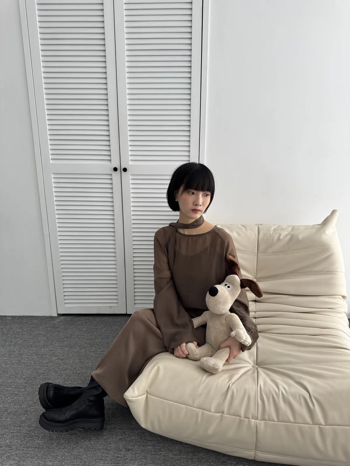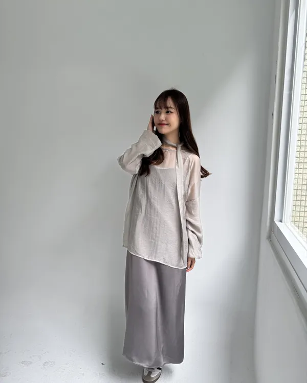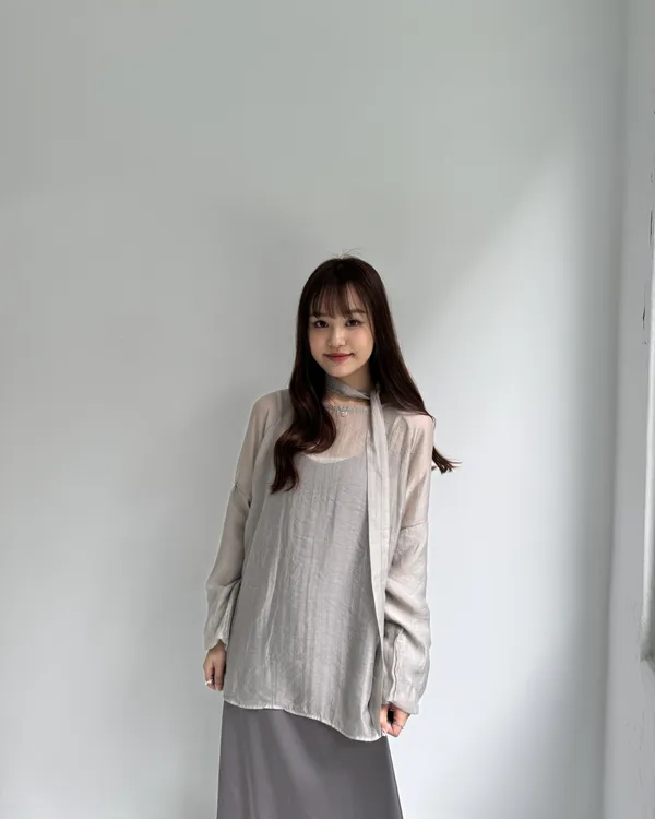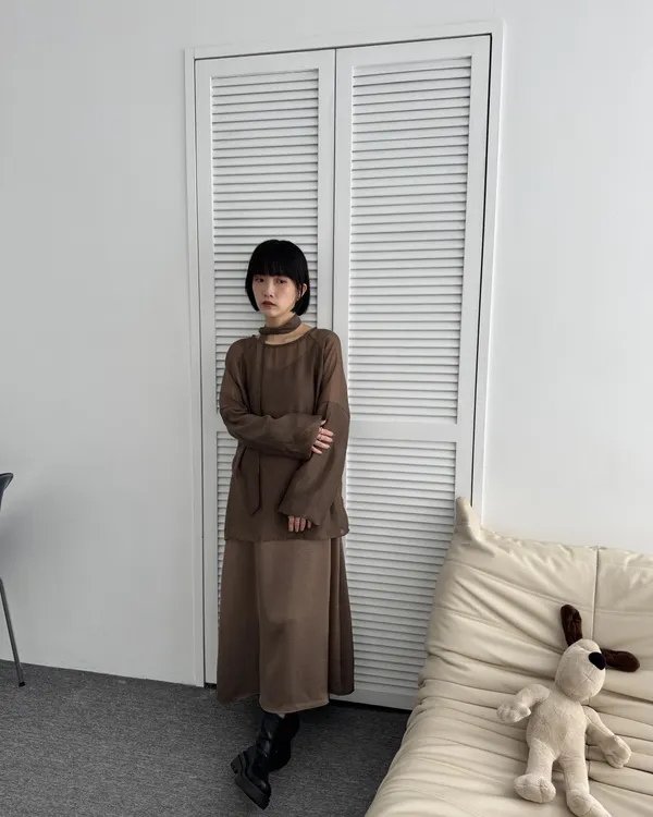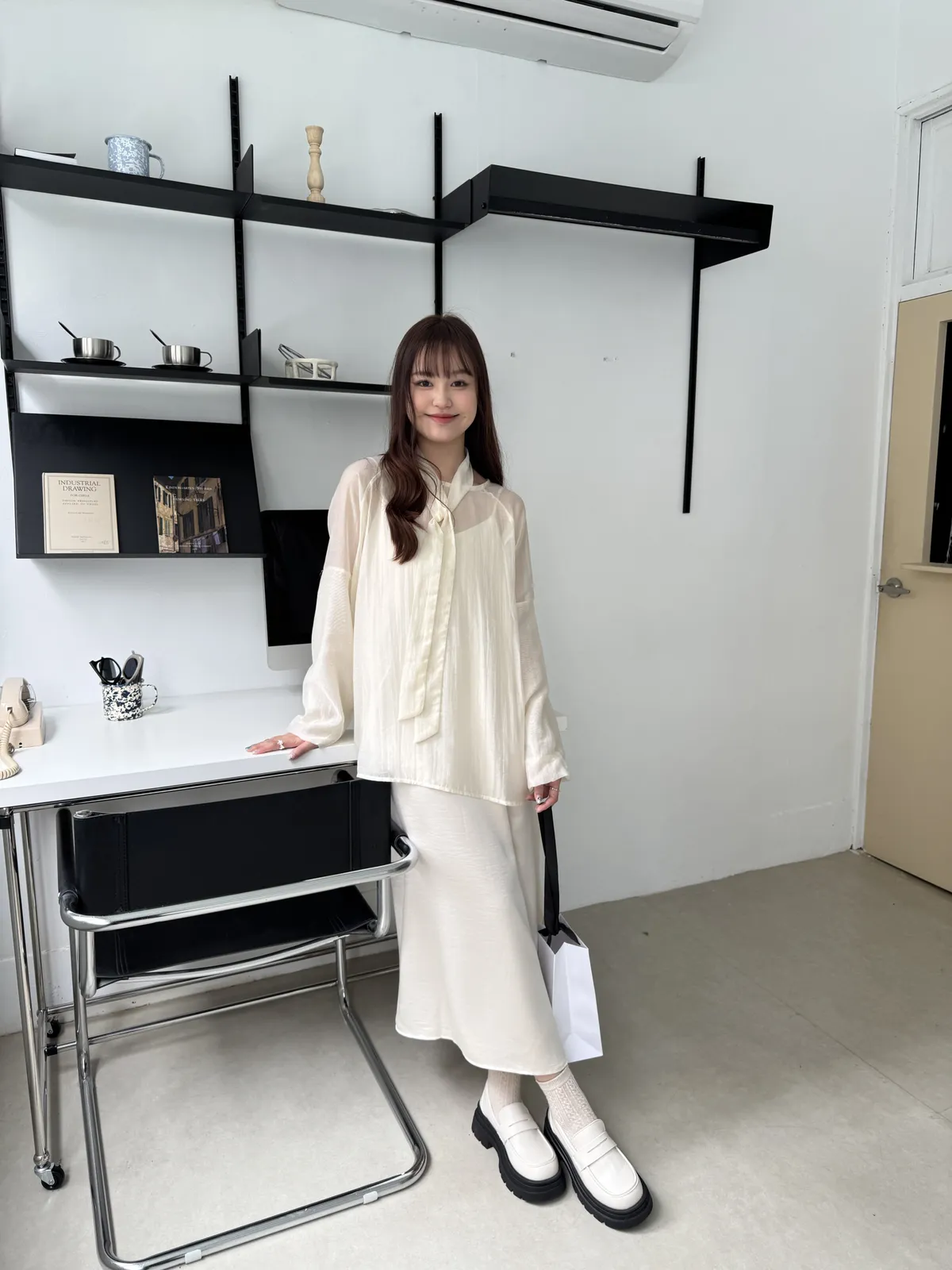 仙女系緞面洋裝+澎袖透膚上衣Set組(附綁帶) 4colors