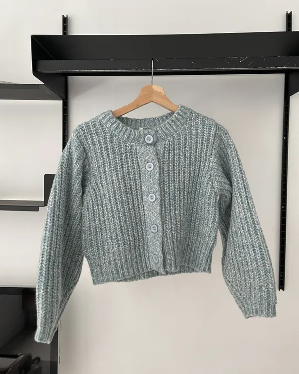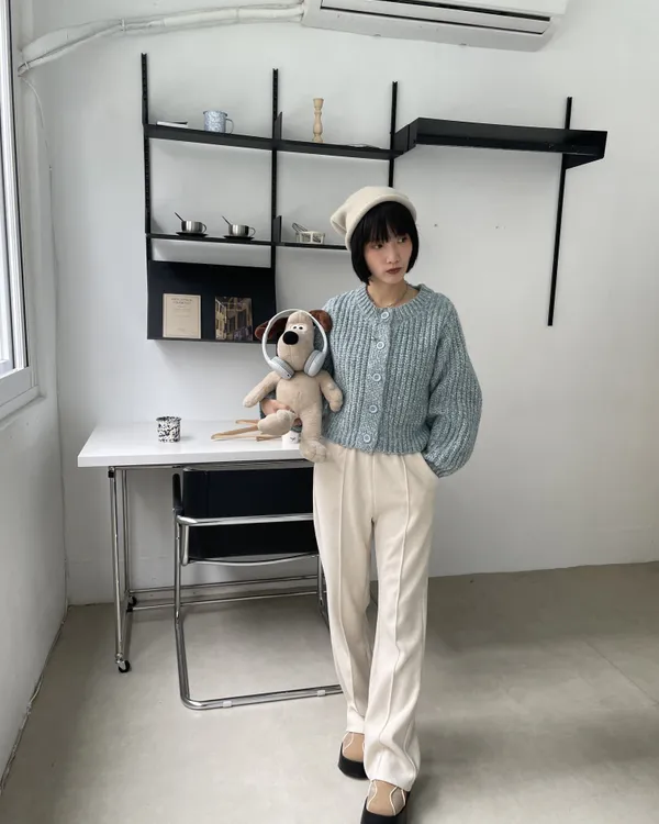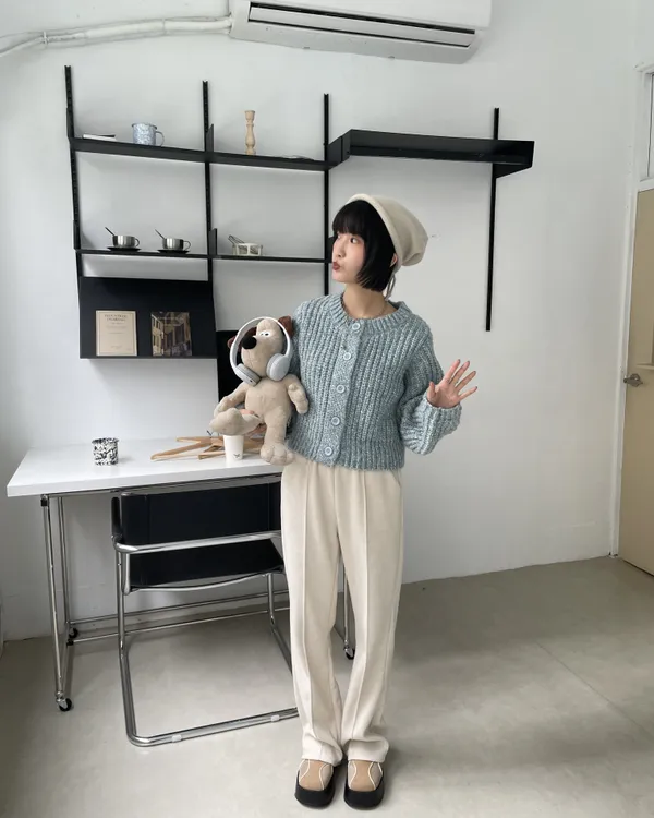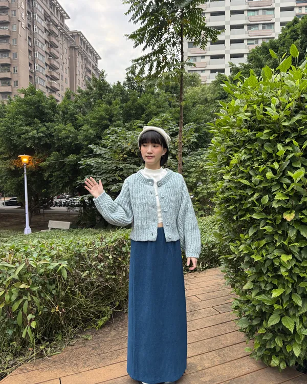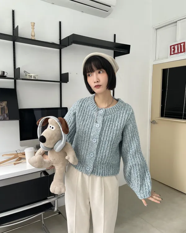 混織排釦圓領澎袖針織上衣