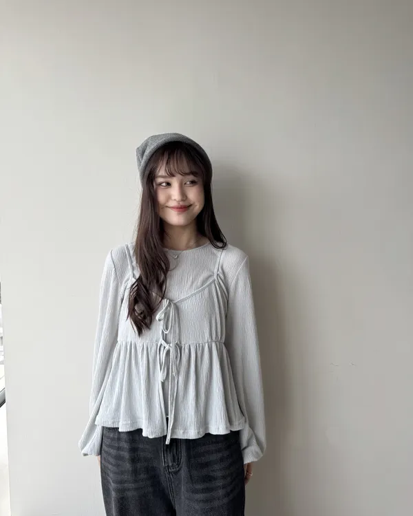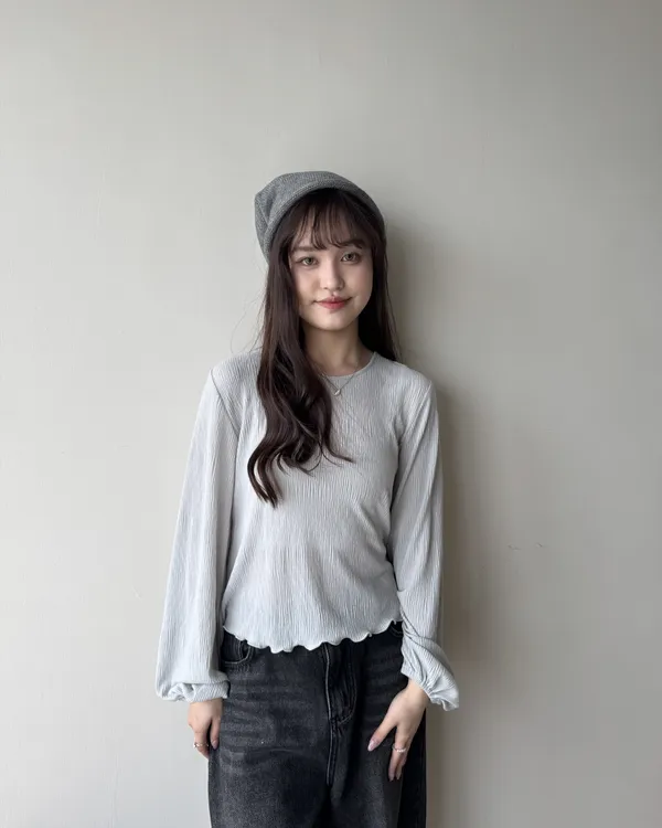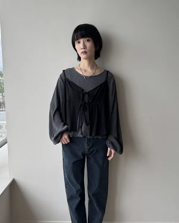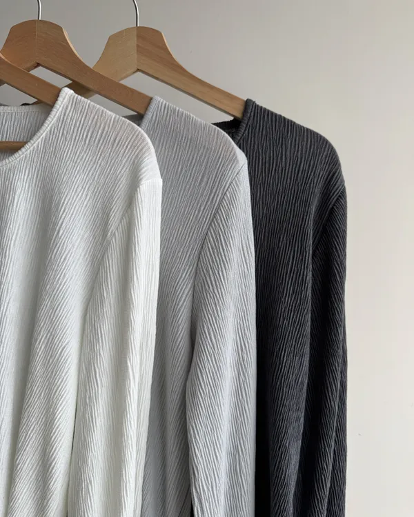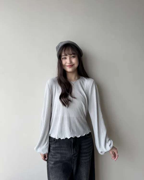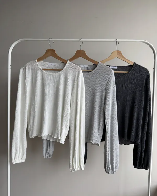坑紋澎袖圓領上衣 3colors