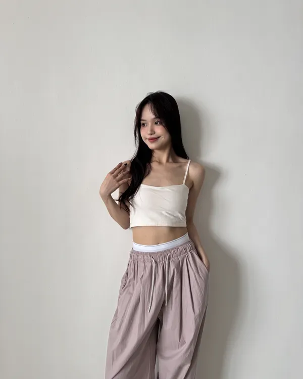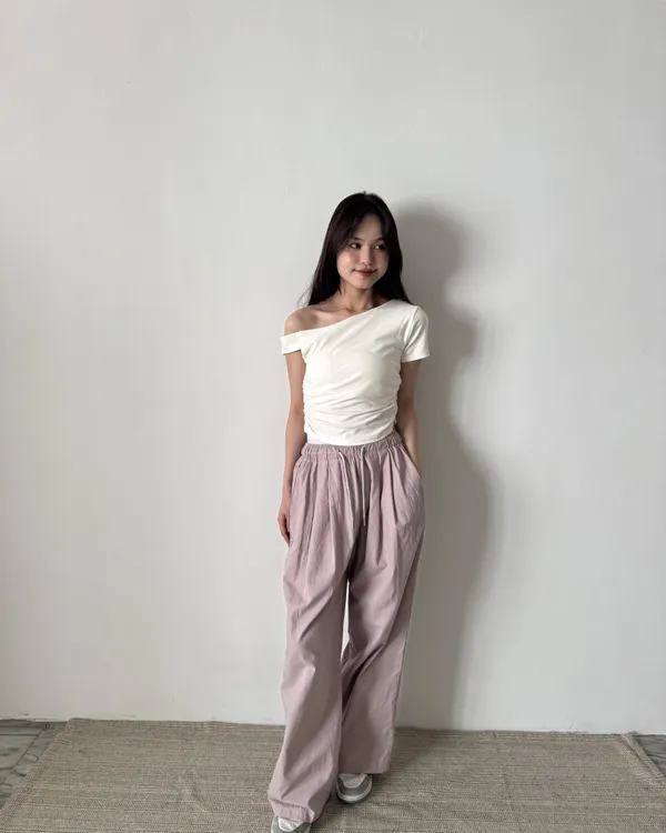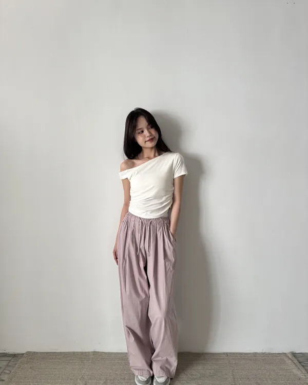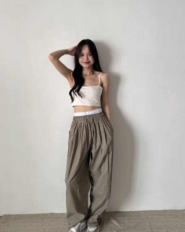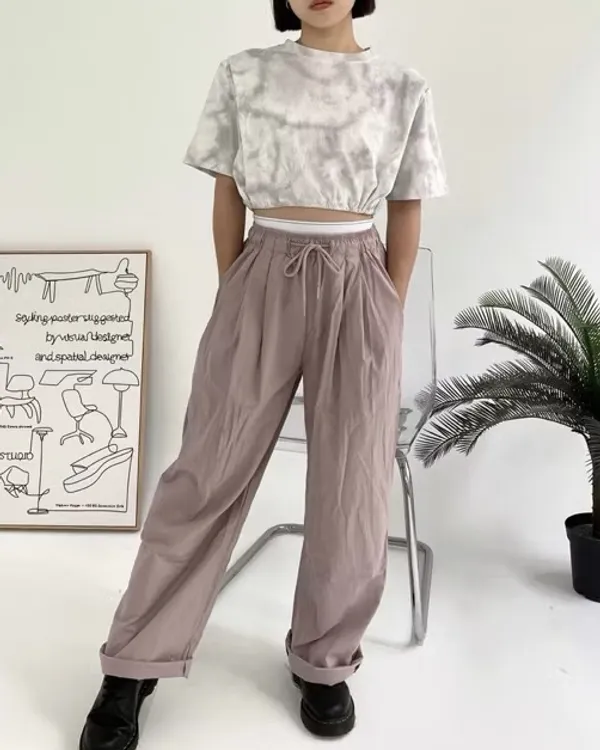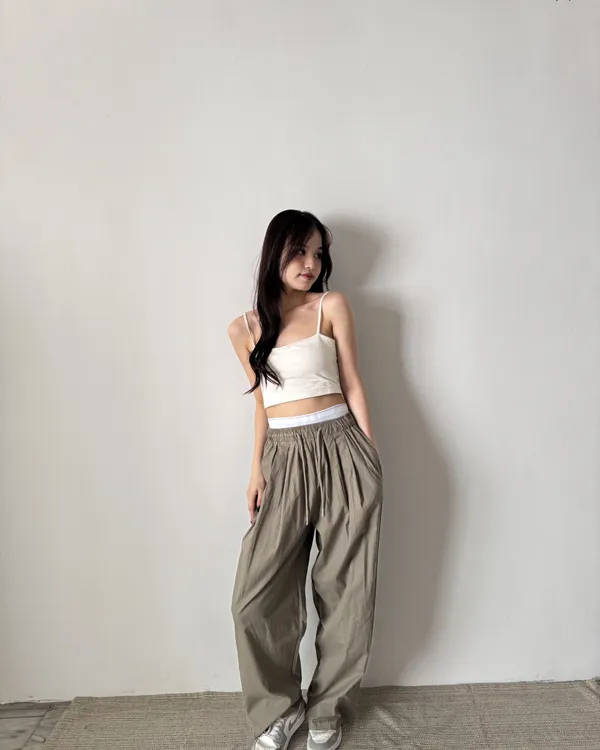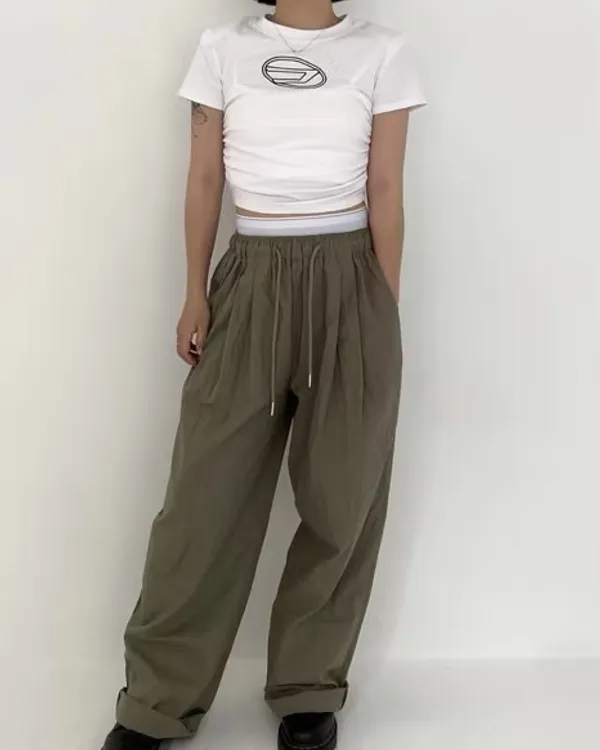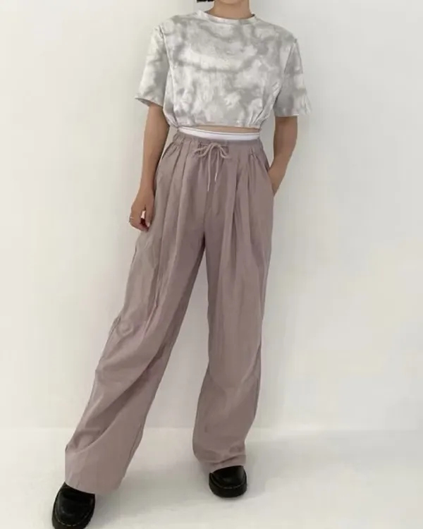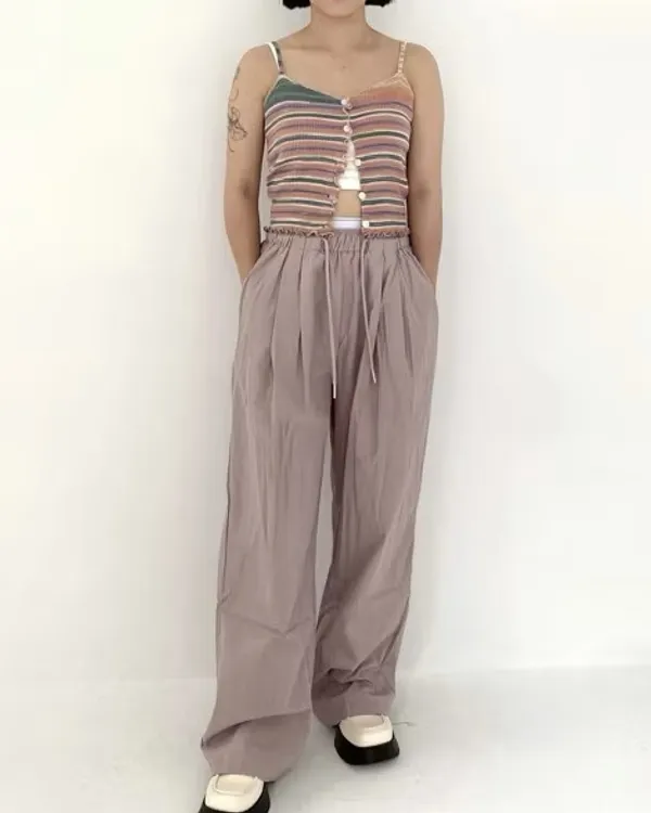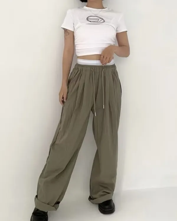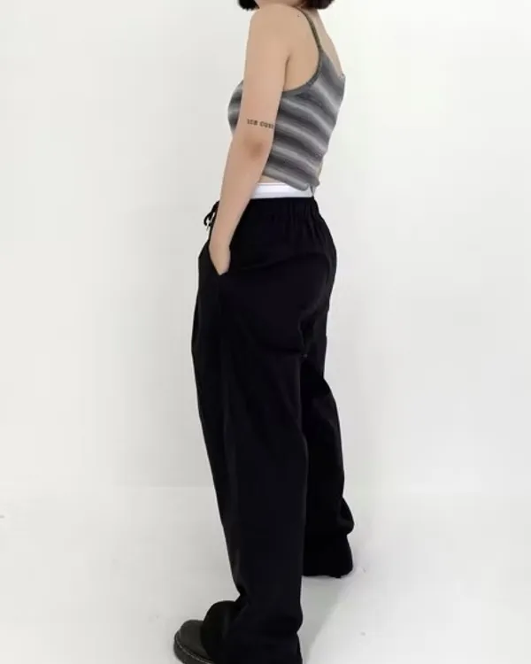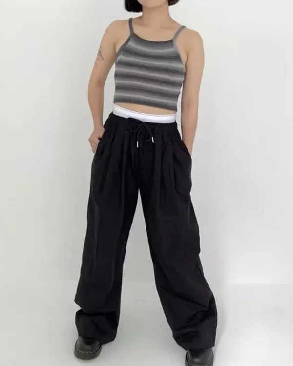 假褲頭設計!拼接寬織帶落地寬褲