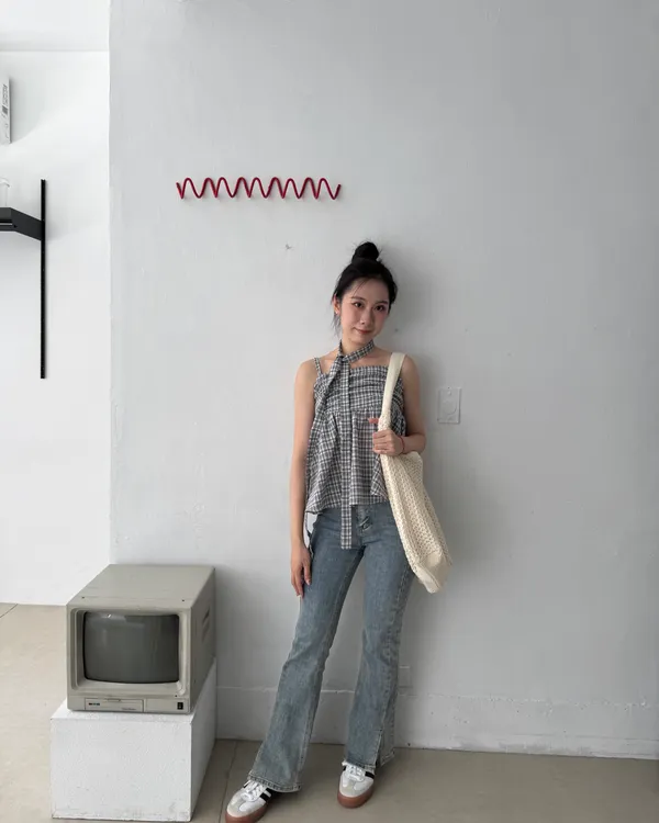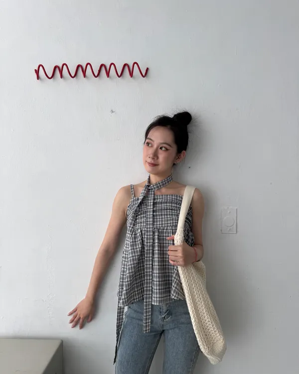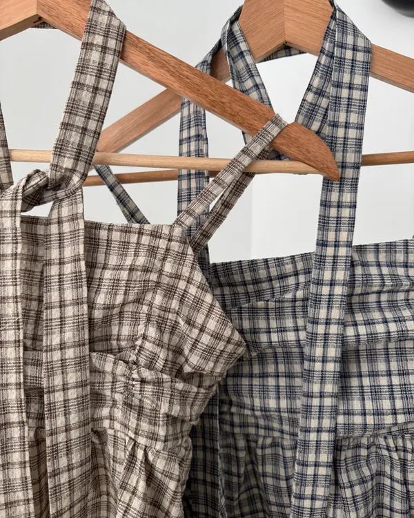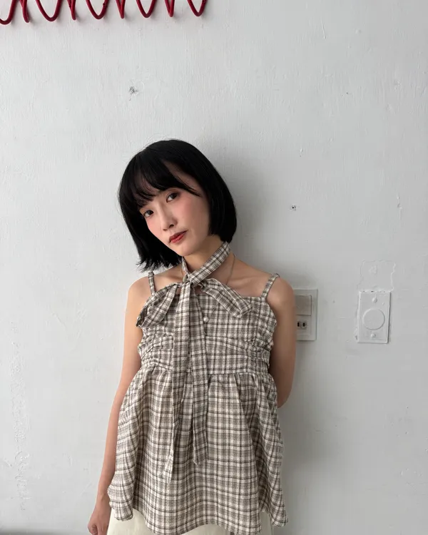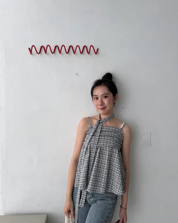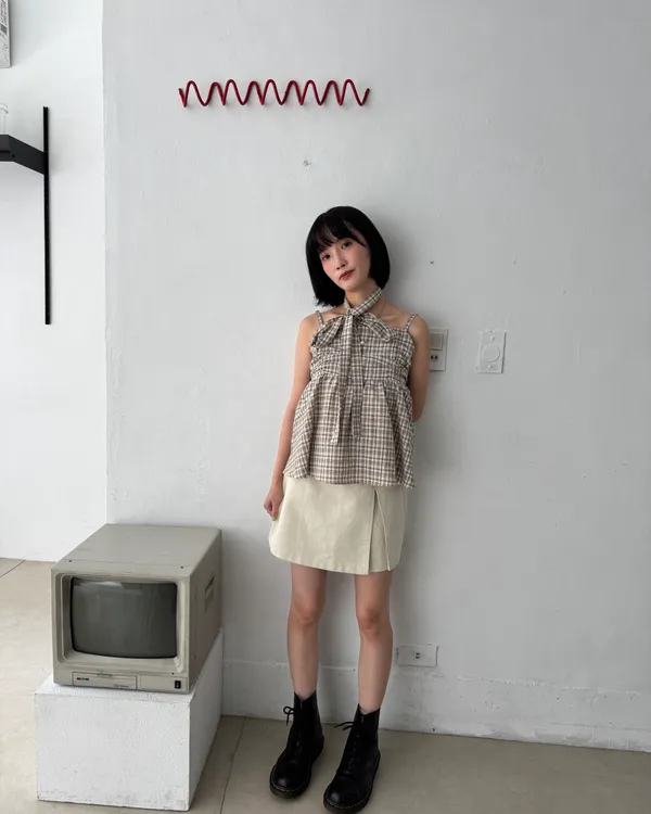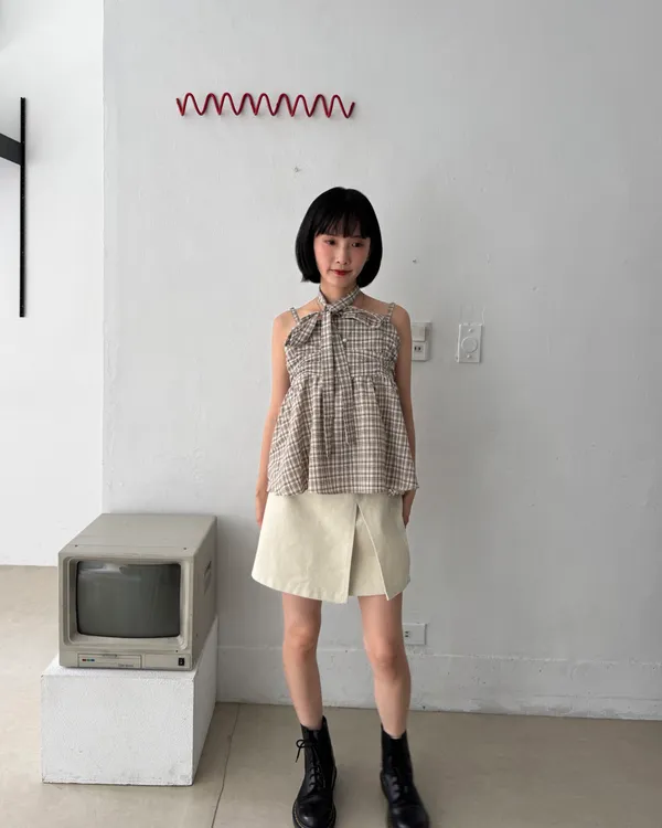 附綁帶抓皺格紋背心 2colors