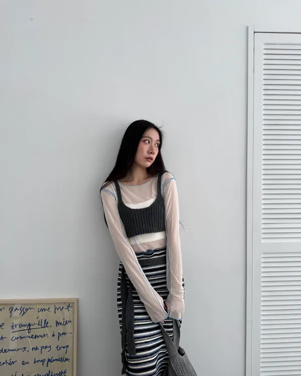 日系撞色車線指套造型透膚上衣 5colors