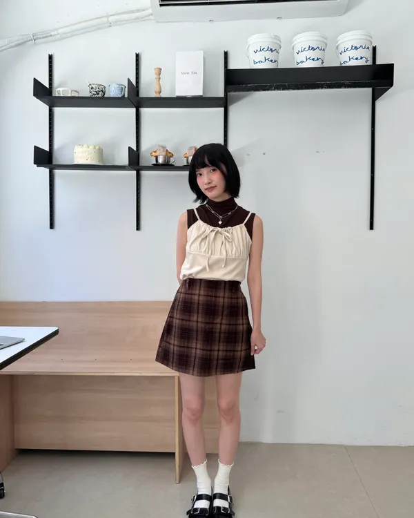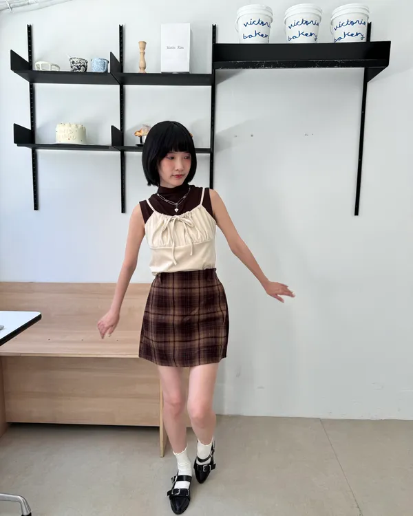 英倫格紋後鬆緊毛呢短裙