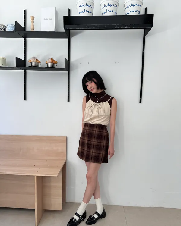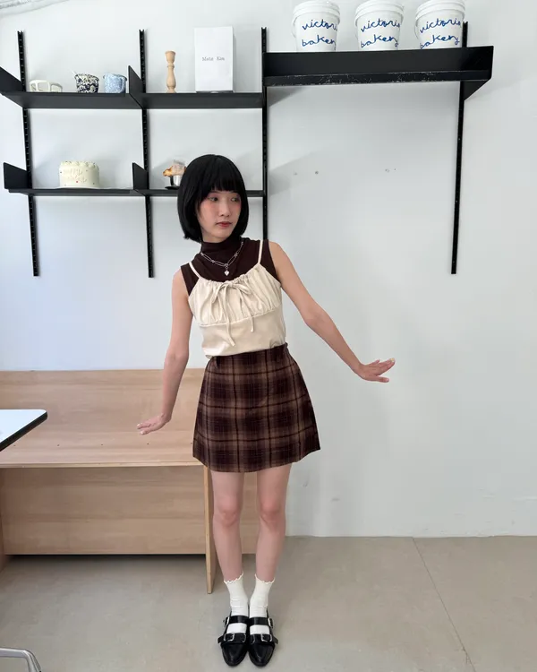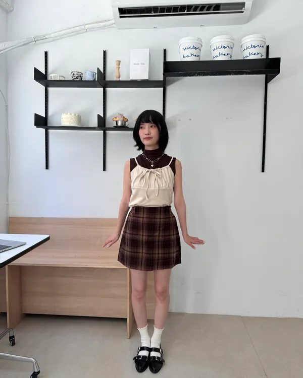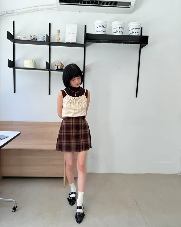 英倫格紋後鬆緊毛呢短裙