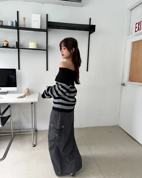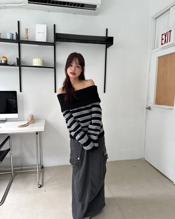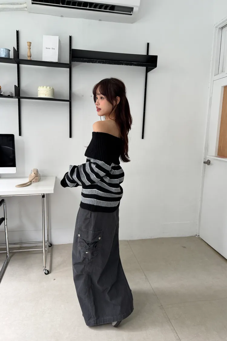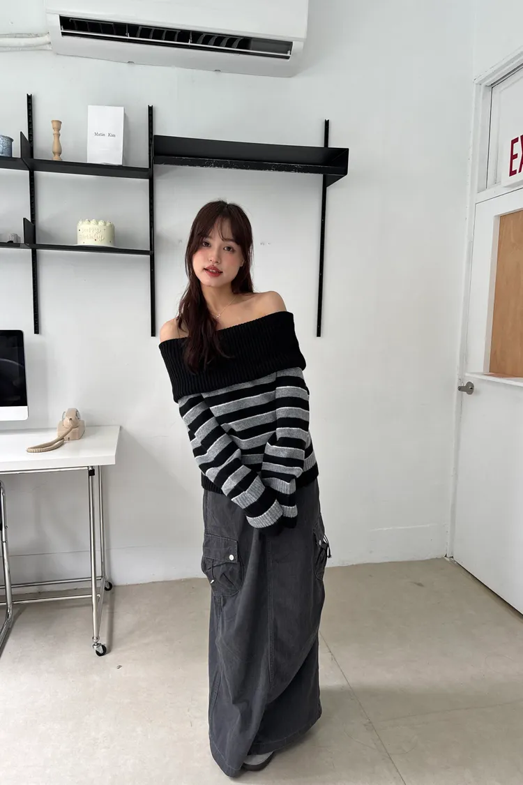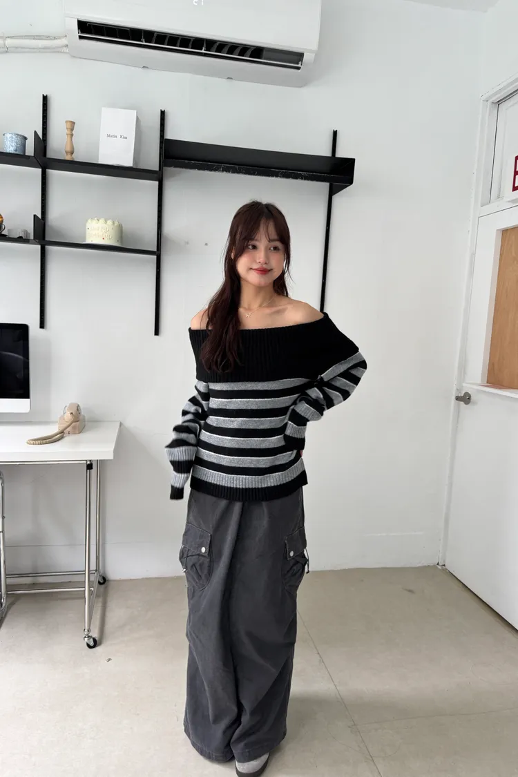 一字領撞色條紋毛衣 2colors