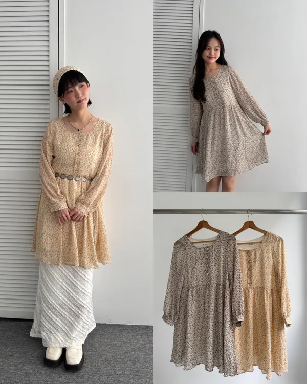 甜美小清新方領雪紡碎花洋裝