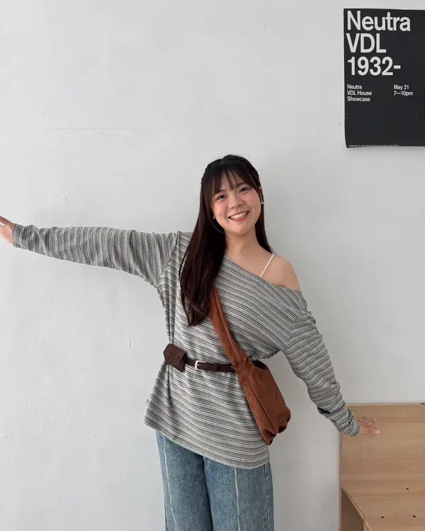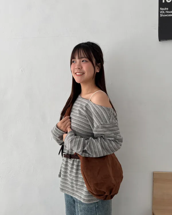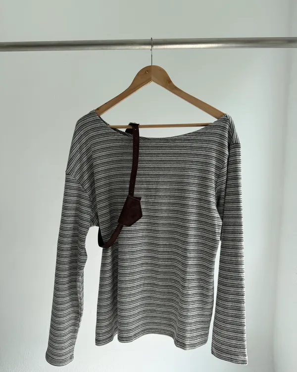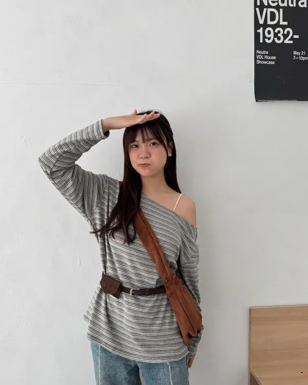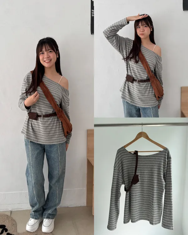 附腰包皮帶!條紋斜肩長Tee